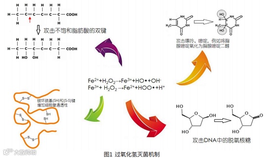 过氧化氢(H2O2)是一种广泛用于消毒、灭菌和防腐的灭菌剂,外观是一种透明无色的液体,市售浓度为3%~90%。H2O2最显著的优点是环保,能迅速降解成无害的水和氧。虽然H2O2纯溶液通常是稳定的,但大多数都含有防止分解的稳定剂。H2O2对病毒、细菌、酵母菌和细菌孢子具有广谱功效,但很多细菌内存在过氧化氢酶或其他过氧化物酶可以增加对低浓度H2O2耐受性。