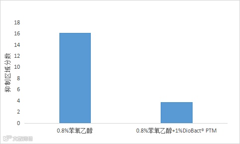 关于常用防腐剂的潜在健康忧虑越来越被宣传,例如尼泊金酯类。所以较低效率的防腐剂,正在越来越多地使用,例如苯氧乙醇。抑制测试的区域证明1% PTM可以提高苯氧乙醇在温和清洁产品中的防腐效率(图2)。