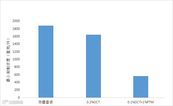 图1 在市售不含去屑成分的香波中,最小抑制浓度显示了含有0.1+%OCT+1%PTM、0.2OCT和不含去屑剂的市售香波的表现
