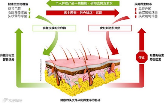 在头皮健康的研究中,越来越多的学者认为,在健康头皮有着大量的微生物,健康的头皮微生态环境由三大平衡维持:油脂、菌群、代谢平衡。