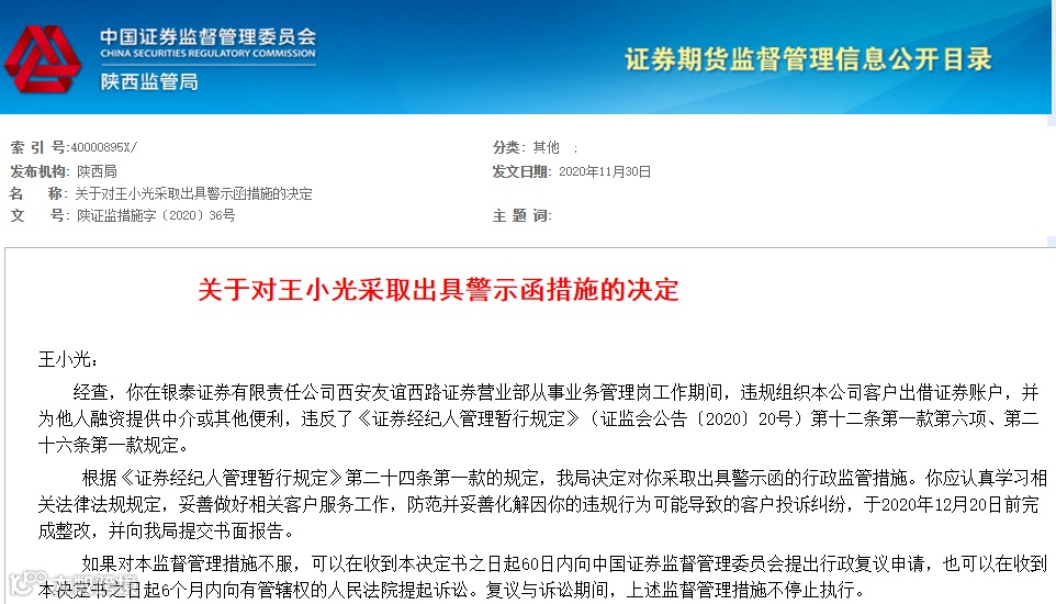 11月30日,陕西证监会网站公布了关于对王小光采取出具警示函措施的决定。