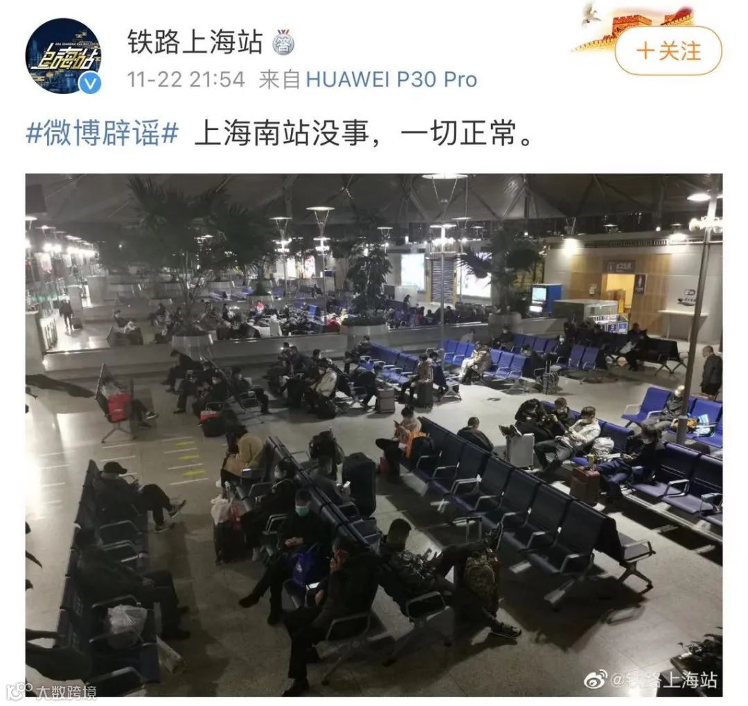 同时,昨天21:54,@铁路上海站 微博辟谣:上海南站没事,一切正常。