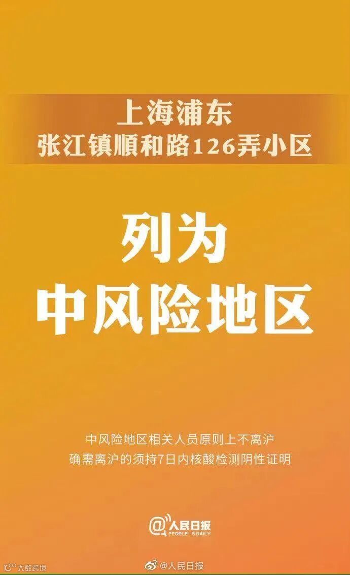 22日,上海将相关病例居住地浦东新区张江镇顺和路126弄小区列为中风险地区,上海市其他区域风险等级不变。中风险地区相关人员原则上不离沪,确需离沪的须持7日内核酸检测阴性证明。