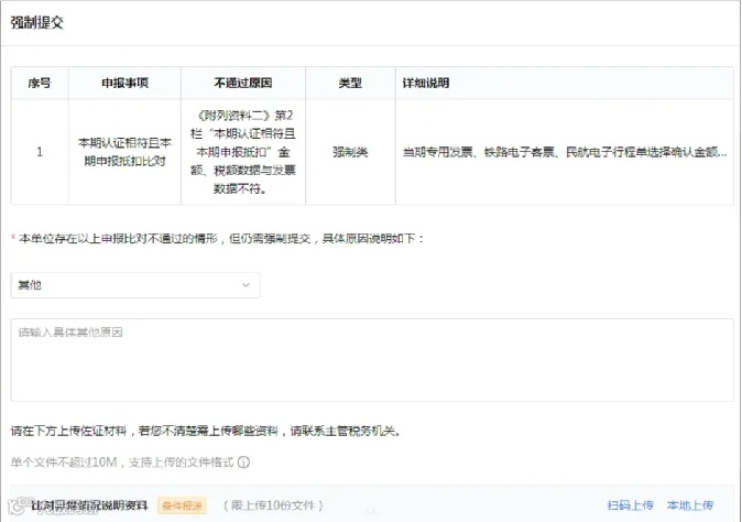 可以强制提交申报,(在强制申报前也可以联系税局人员看看没有其他方式解决)强制提交申报写明原因,上传相关勾选认证铁路电子客票明细等相关证明提交后会被锁死,无法开具发票,联系税局人员解锁,如果着急就带公章申报表去大厅解锁。(地区不同,各地税局系统设置不同,以当地税局为准)