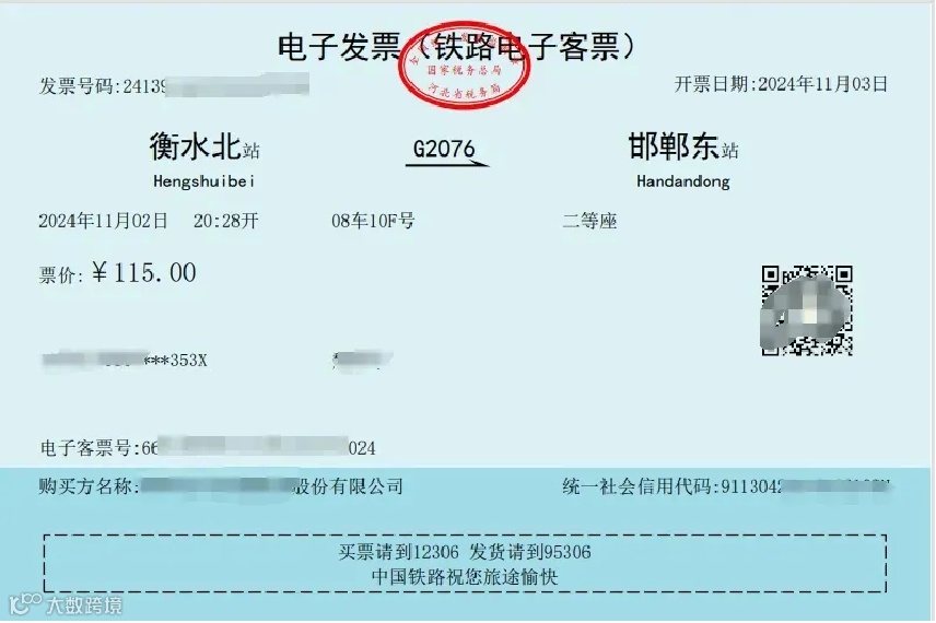 提示:申请开具的报销用电子发票(铁路电子客票)时务必开具公司抬头及税号(公司抬头:某有限公司,税号:公司统一社会信用代码)在申报增值税之前,勾选确认铁路电子客票,