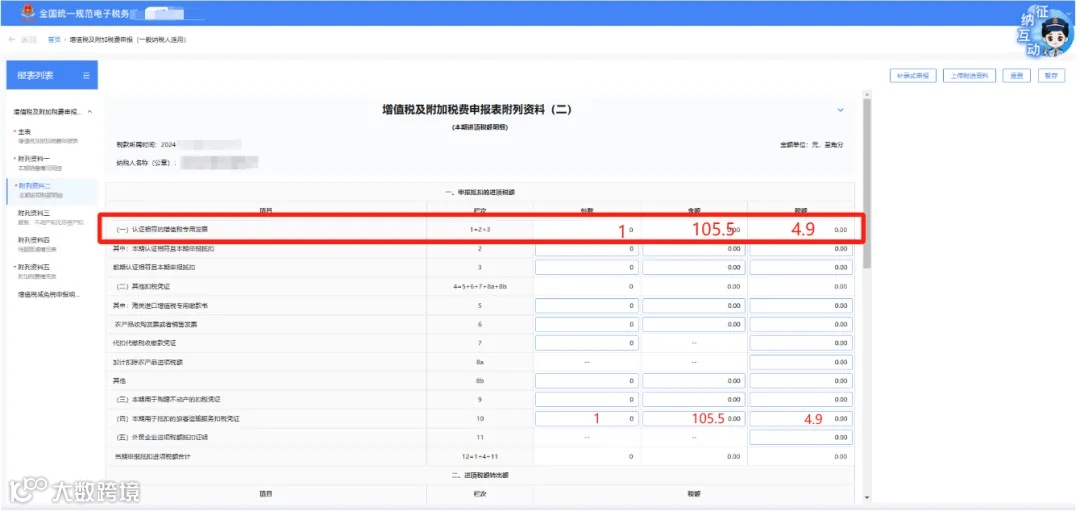 勾选确认后申报增值税系统会自动识别到《增值税及附加税费申报表附列资料(二)》(本期进项税额明细)“认证相符的增值税专用发票”相关栏次中和第10栏次。
