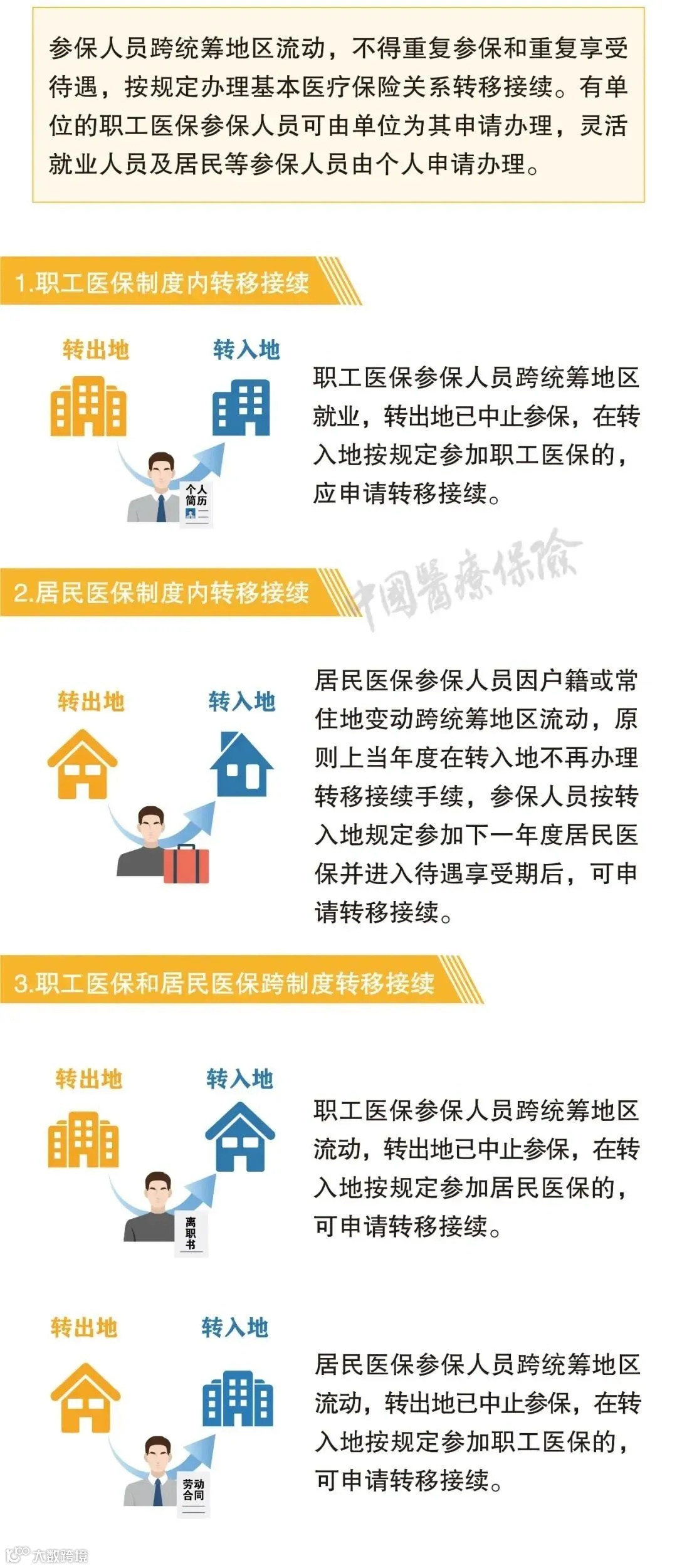 在这个文件中,对医保关系的转移接续,在全国层面上统一了经办流程,规范了待遇衔接。看完这张图,大家就能搞懂医保的转移接续啦~