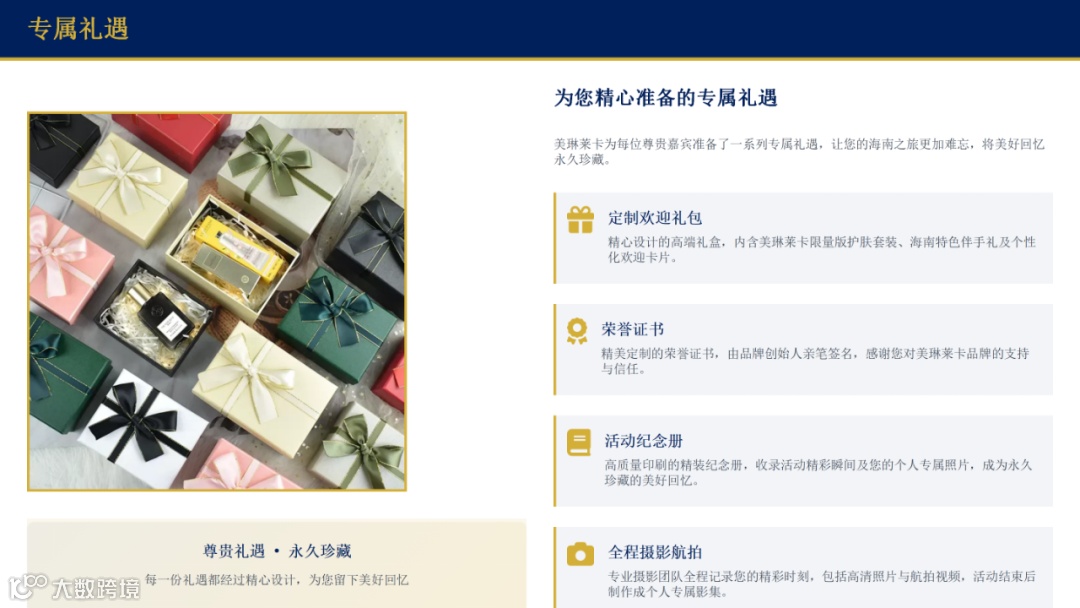 精心设计的定制欢迎礼包,内含美琳莱卡限量版护肤套装、海南特色伴手礼以及个性化的欢迎卡片。每一件礼品都经过精心挑选,承载着我们对您的感谢与敬意。