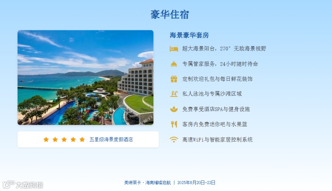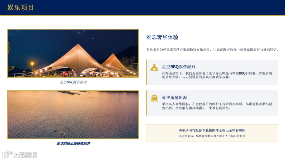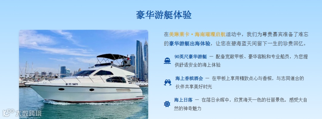 第二天的豪华游艇出海体验,更是将奢华推向极致。私人豪华游艇将载着您在海南的碧海蓝天中自由巡游,金色的落日在海平面上缓缓沉落,香槟的气泡在杯中轻舞,精致的小食在唇齿间留香。