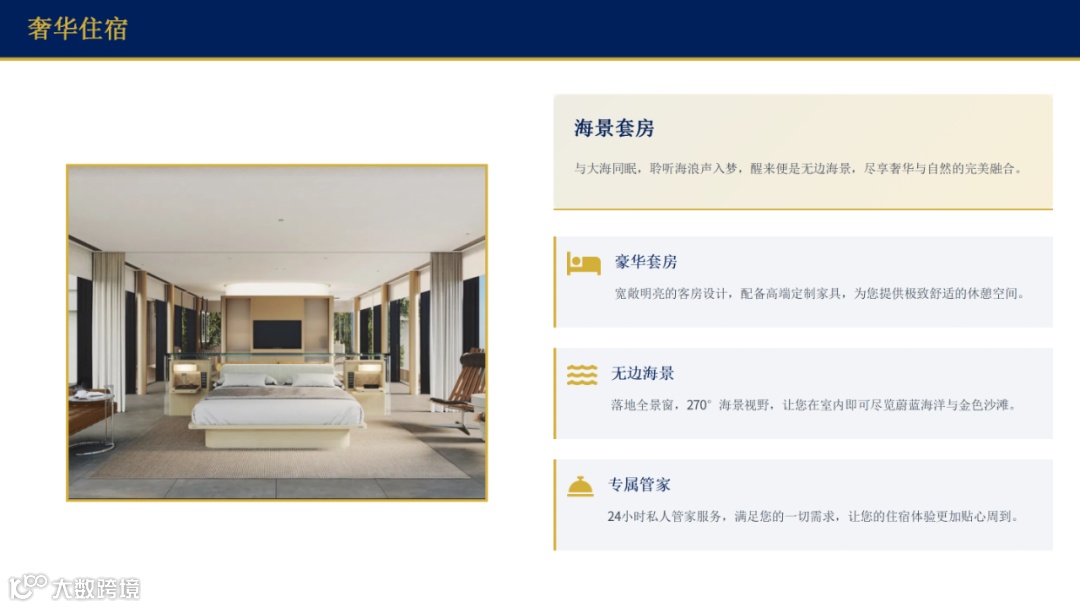 宽敞明亮的客房设计,配备高端定制家具,每一处细节都彰显着奢华与品味。24小时私人管家服务,随时满足您的一切需求,让您的住宿体验更加贴心周到。这里不仅是您的临时居所,更是您在海南的专属私人天堂。