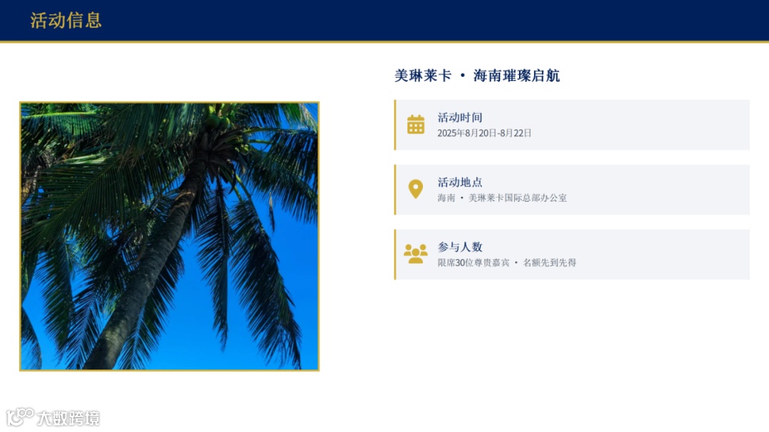 活动时间:2025年8月20日-8月22日活动地点:海南 · 美琳莱卡国际总部办公室限席人数:仅限30位尊贵嘉宾