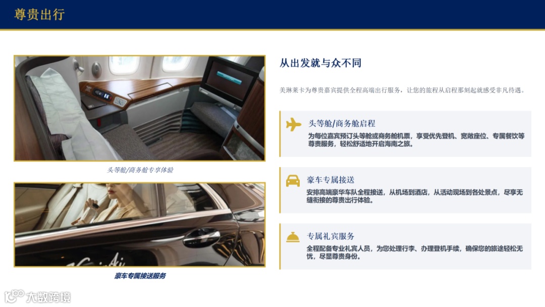 抵达海南后,豪华车队将在机场恭候您的到来。从机场到酒店,从活动现场到各处景点,专属司机将为您提供无缝衔接的尊贵出行体验。每一公里的路程,都是对您身份的礼遇与尊重。