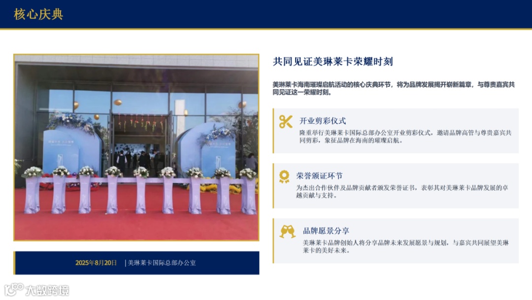 2025年8月21日,将是美琳莱卡品牌发展史上的重要里程碑。在美琳莱卡国际总部办公室,我们将隆重举行开业剪彩仪式。您将与品牌创始人、行业精英一同剪彩,见证美琳莱卡在海南的璀璨启航。