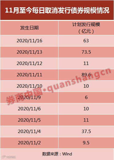 13日也有73.5亿规模债券表示不能如期发行。就在11月16日,又有63亿规模债券取消发行。整体而言,从11月9日至16日,共有253.1亿规模债券取消发行。