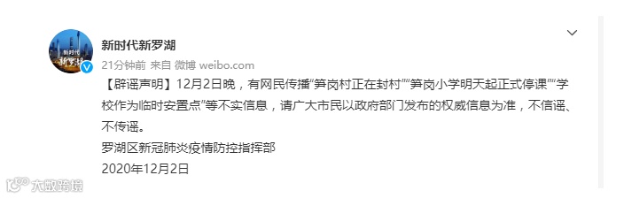 12月2日晚上11时左右,记者在笋岗村牌坊前看到,现场居民有序进出。罗湖区新冠肺炎疫情防控指挥部随后也发布消息:有网民传播“笋岗村正在封村”等不实信息,请广大市民以政府部门发布的权威信息为准,不信谣、不传谣。