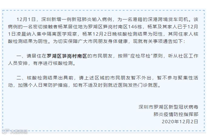 据深圳市罗湖区新型冠状病毒肺炎疫情防控指挥部2日晚间发布的消息,12月1日深圳新增一例新冠肺炎输入病例,为一名港籍的深港跨境货车司机。该病例的一名密切接触者杨某居住地为罗湖区笋岗村南区146栋,杨某及其家人已于12月1日凌晨纳入集中隔离医学观察,杨某12月2日晚核酸检测结果为阳性,其同住家人核酸检测结果为阴性。