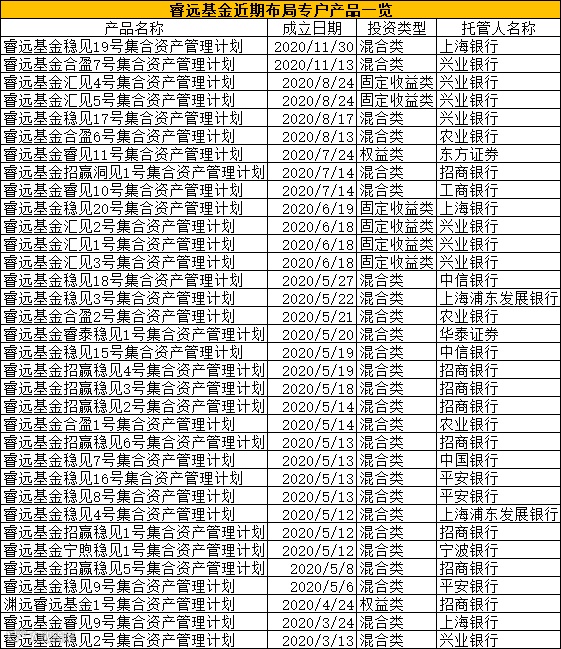 基金业协会数据显示,截止12月4日,今年以来,睿远基金合计备案了包括睿远基金稳见19号集合资产管理计划在内34只专户产品,其中6只为固定收益类,混合类的共有26只,权益类的则有2只。托管机构包括招商银行、东方证券、兴业银行、上海银行等多家机构。
