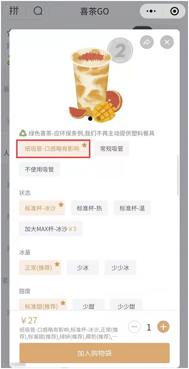 在深圳福田区的一家喜茶店,记者看到店内提供纸吸管和常规吸管两种吸管,喜茶的下单小程序上提示“应环保条例,我们不再主动提供塑料餐具”,其下就是涉及吸管的3个可选项,默认第一个选项就是纸吸管。