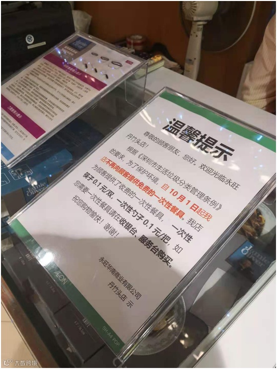 在深圳市龙岗区某永旺超市门店,记者了解到,从今年10月1日起开始该超市已经不提供免费的一次性筷子和勺子,顾客如有需要可以付费购买,对此,商场在醒目位置已有提示。