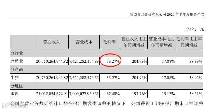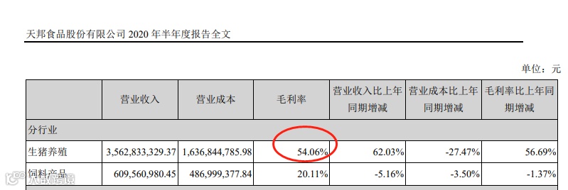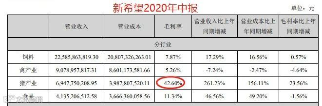 从同行对比来看,2020年上半年,主要靠自繁自养的牧原股份(002714)、天邦股份(002124)生猪养殖毛利率分为63.27%和54.06%,而新希望披露的猪产业毛利率则为42.6%,三者有明显差距。