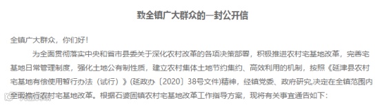 信中指出,决定在全镇范围内全面推行农村宅基地改革,是为了全面贯彻落实中央和省市县委关于深化农村改革的各项决策部署,积极推进农村宅基地改革,完善宅基地日常管理制度,强化土地公有制性质,建立农村集体土地节约集约、高效利用的机制。