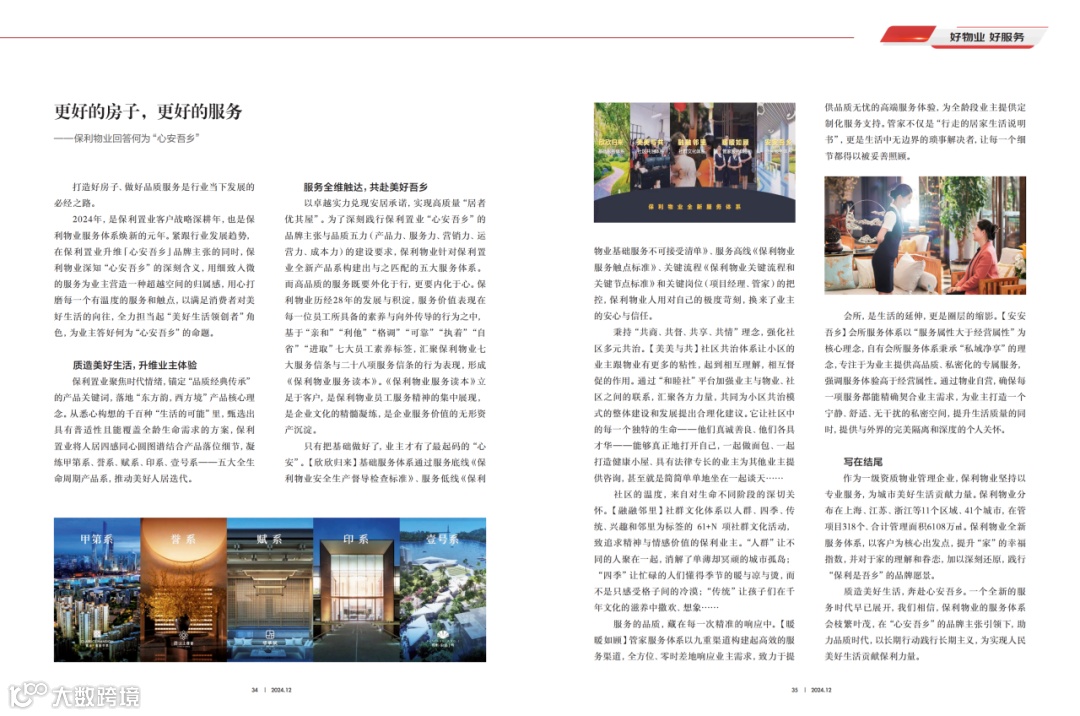 近日,2024年第12期《中国物业管理》杂志刊登了文章《更好的房子,更好的服务——保利物业回答何以“心安吾乡”》,对保利置业旗下保利物业全新服务体系内容进行了报道,以下为全文内容: