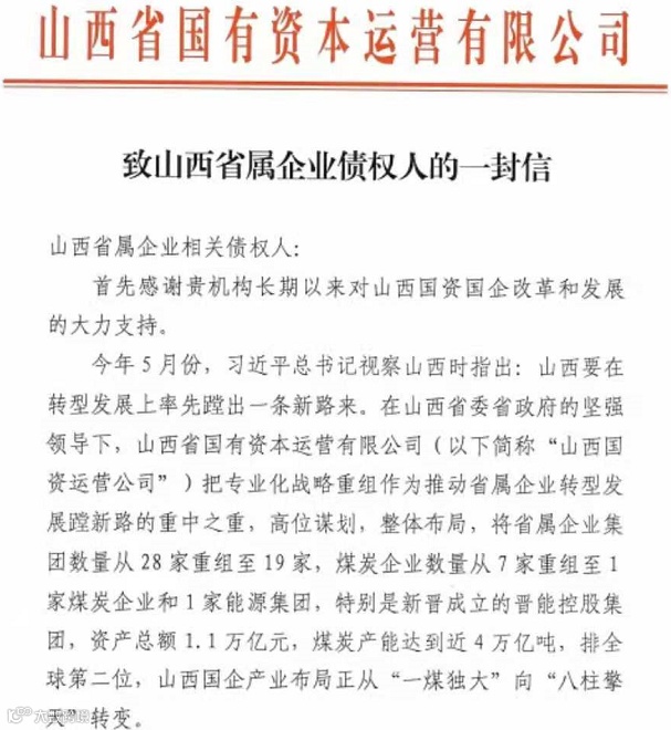 11日15日早上,一份来自山西国有资本运营公司的《致山西省属企业债权人的一封信》在市场流传。在该信中,山西国有资本运营公司表示,经过整合,山西国企已经脱胎换骨,面貌一新,解决了过去内部产业趋同,低水平同质发展,无序同业竞争的突出问题,山西国企迎来了史上最好的发展时期。