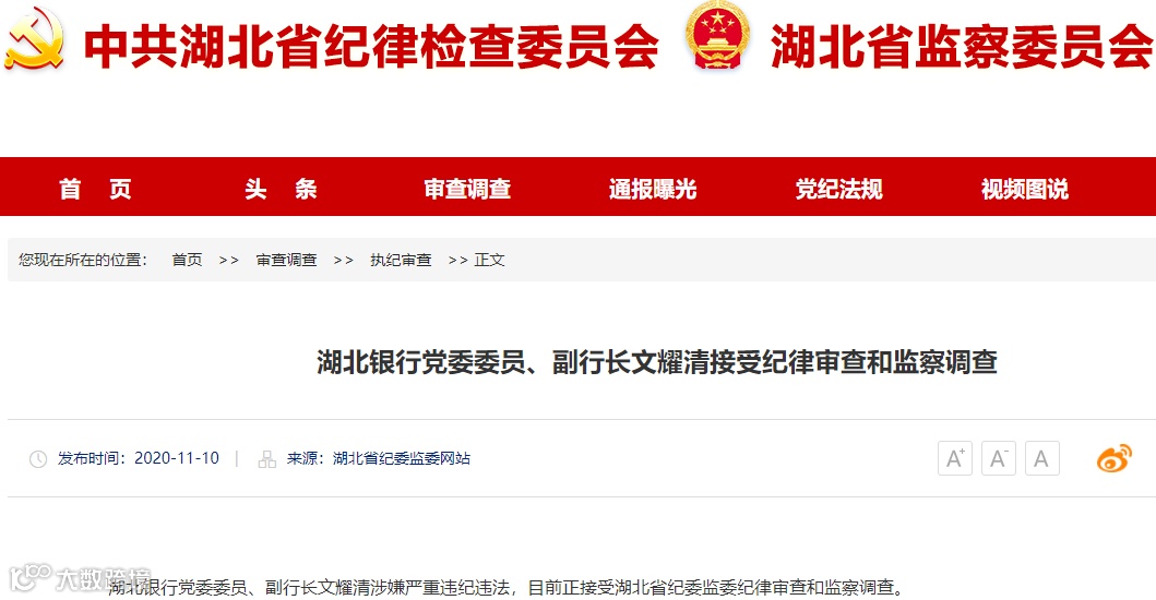 11月10日,据湖北省纪委监委网站消息,湖北银行党委委员、副行长文耀清因涉嫌严重违纪违法,目前正接受湖北省纪委监委纪律审查和监察调查。