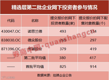 网下打新参与人数大幅减少。回顾精选层首批网下询价,平均每个项目有825家网下投资者报价,涉及配售对象平均914个。