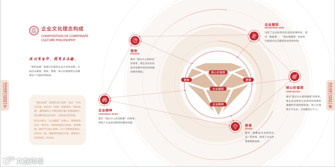 《保利品格-保利集团企业文化手册》立足企业文化视角,回顾保利近40年来的历史积淀与探索追求,凝练薪火相承的文化品格,以钻石模型五大维度,深耕保利集团企业文化理念的根与魂。