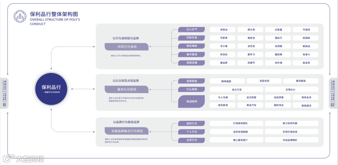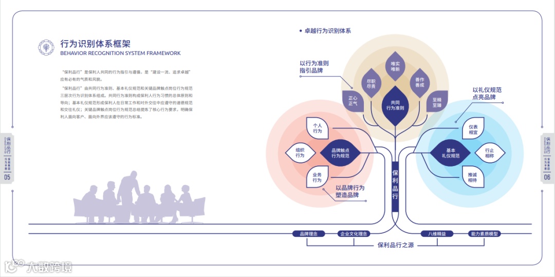 《保利品行-保利集团行为手册》搭建卓越行为识别体系框架,明晰了全体保利人的卓越行为倡导,以共同行为准则、基本礼仪规范、关键品牌触点行为支撑品行之树,规范全体保利人的知与行。