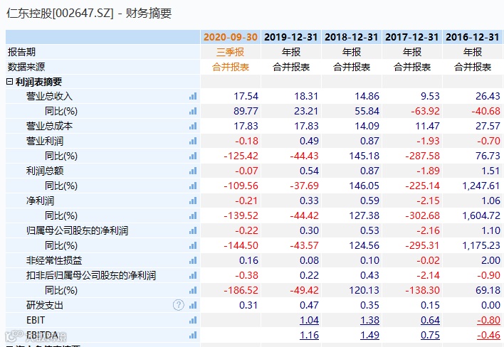 而恰好仁东控股于2020年10月29日披露三季报,公司2020年前三季度实现营业总收入17.5亿,同比增长89.8%;实现归母净利润-2192.3万,上年同期为4926.3万元,同比减少144.5%。