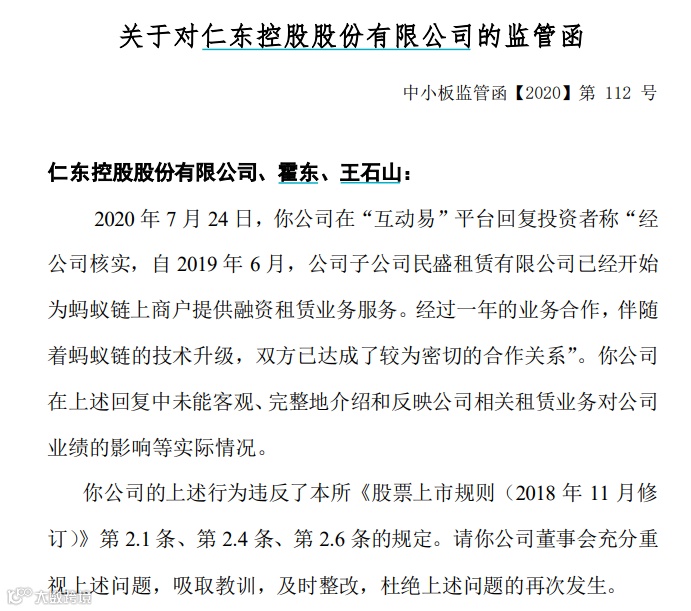 但随后,仁东控股实控人、董事长兼董秘霍东、总经理兼财务总监王石山,就因公司“介绍合作蚂蚁集团不客观”被浙江证监局警示,并且受到监管函。监管直接指出,“上述回复中未能客观、完整地介绍和反映公司相关租赁业务对公司业绩的影响等实际情况。”