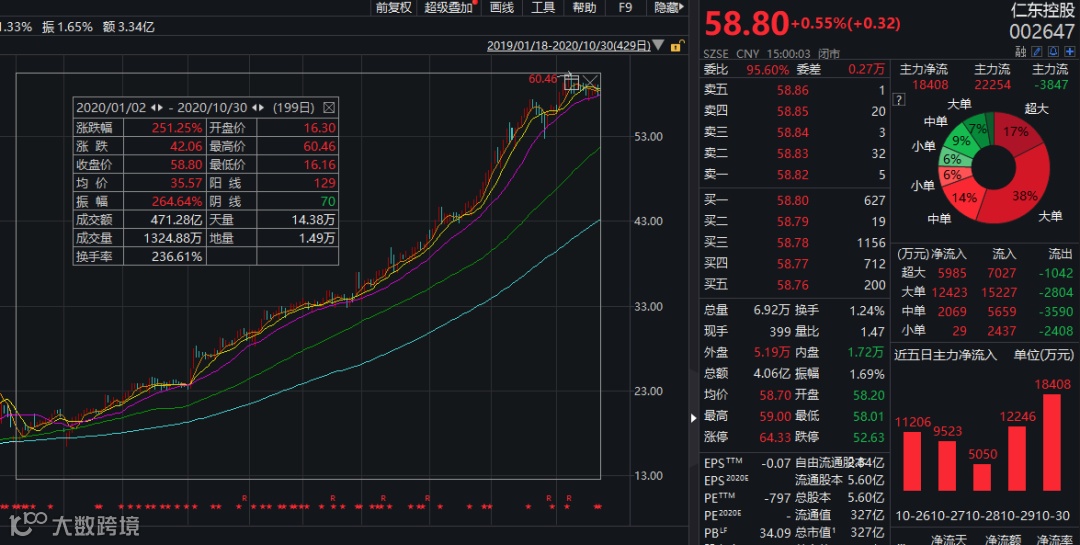 而值得注意的是,仁东控股是今年的大牛股。最新数据显示,今年以来该股从大概17元暴涨至58.8元,暴涨超250%。