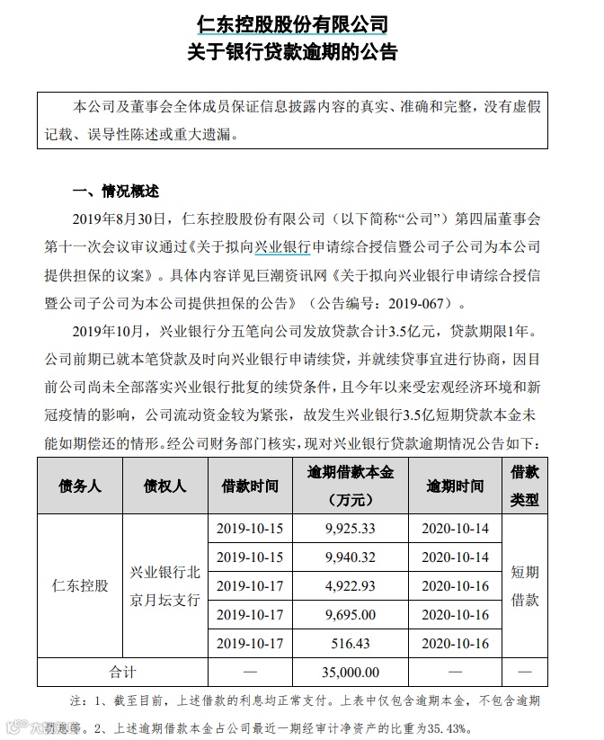 10月29日晚间,今年暴涨250%的300亿大牛股:仁东控股,公告贷款3.5亿逾期,随后交易所火速发出关注函。