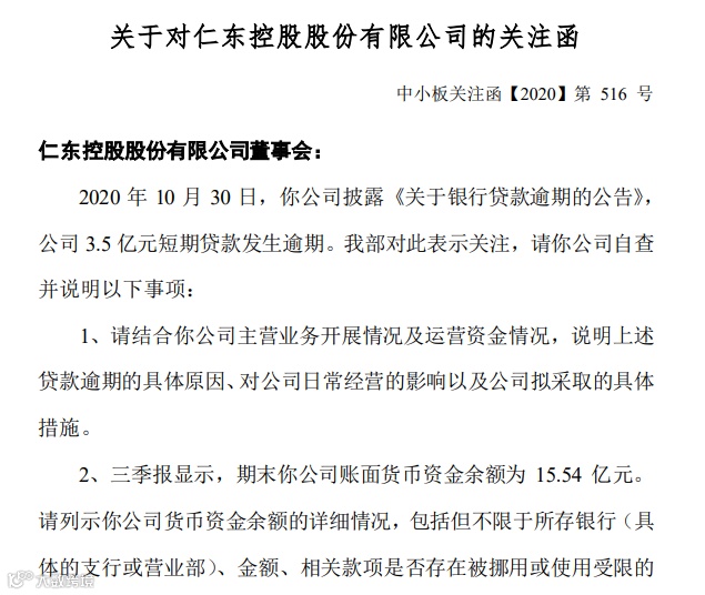 对此,深交所火速出手,发出关注函。要求仁东控股说明: