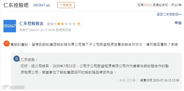 7月24日,仁东控股机智地在互动平台透露:“经公司核实,2020年7月23日,公司子公司民盛租赁有限公司作为首家与蚂蚁链合作的融资租赁公司,受邀参加了蚂蚁集团召开的蚂蚁链品牌发布会。”
