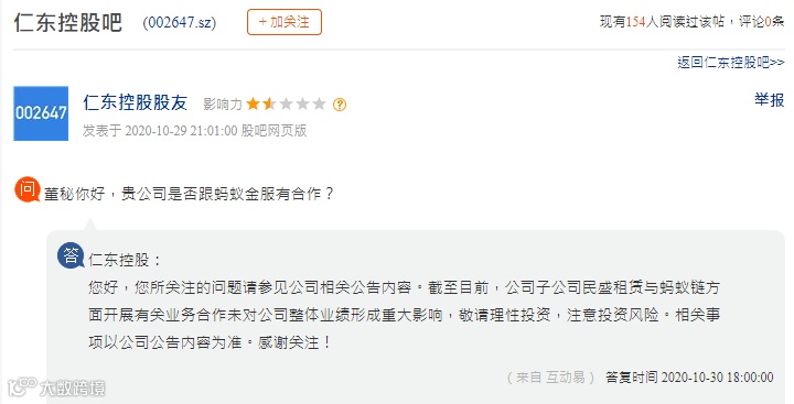 10月30日,仁东控股回复:截至目前,公司子公司民盛租赁与蚂蚁链方面开展有关业务合作未对公司整体业绩形成重大影响,敬请理性投资,注意投资风险。相关事项以公司公告内容为准。