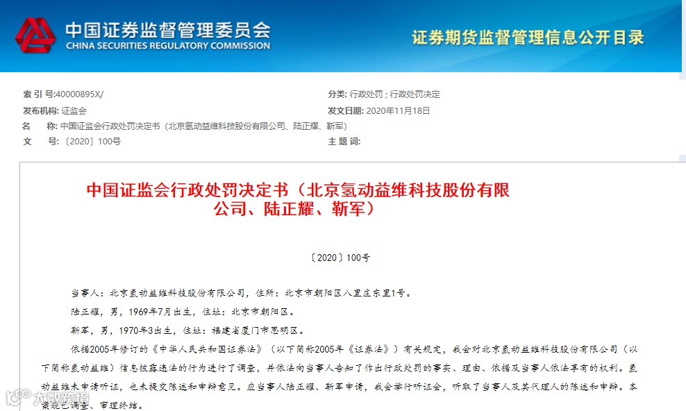 对此,证监会最终对氢动益维给予警告,并处以30万元罚款;对陆正耀和靳军给予警告,并分别处以10万元、5万元罚款。
