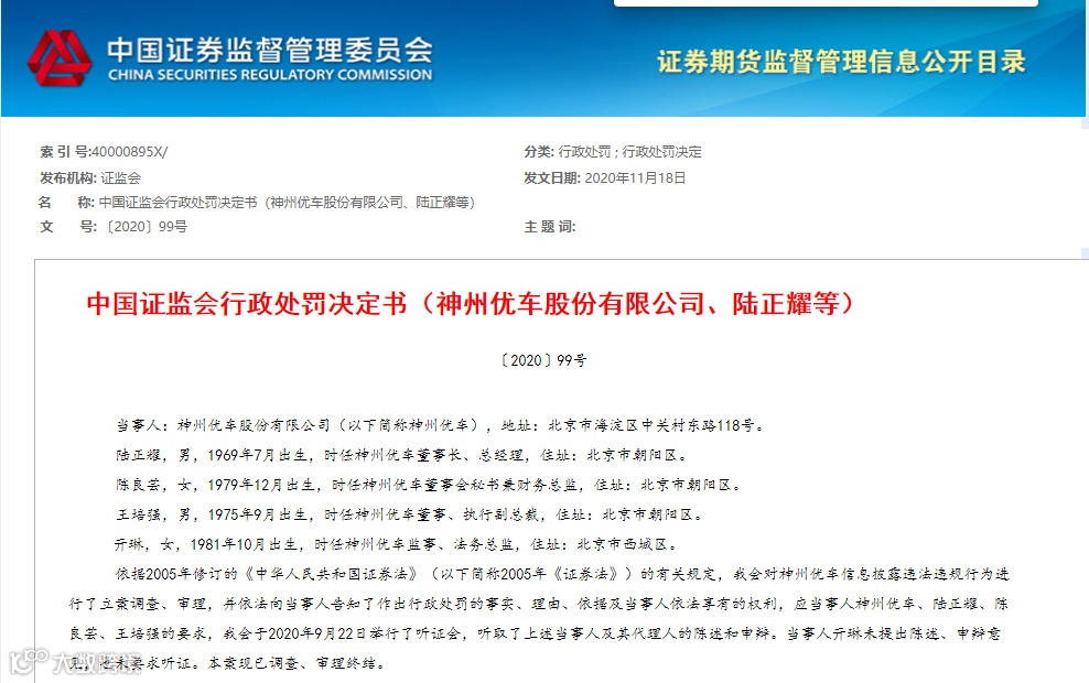 对于相关信披违规行为,证监会对对神州优车给予警告,并处以50万元的罚款;对陆正耀等4人给予警告,并处以5万至20万元罚款。