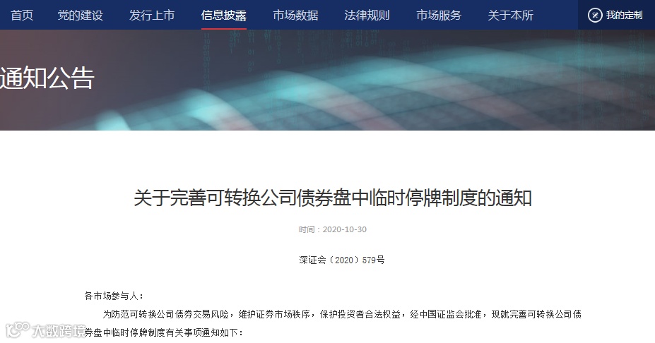 10月30日深交所对可转换公司债券盘中临时停牌制度进行优化,旨在防范可转换公司债券交易风险,维护证券市场秩序,保护投资者合法权益。相比此前最大变化在于,此次优化最大的举措,就是盘中成交价若较前收盘价首次上涨超过30%,将临停至14:57。此次调整将在11月2日施行。
