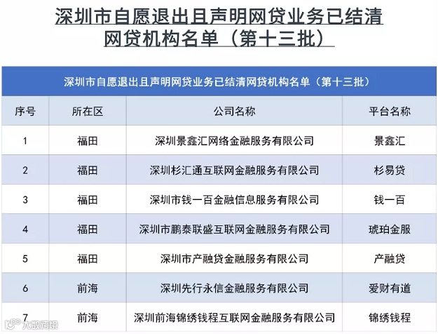 近日,深圳市互联网金融风险专项整治工作领导小组办公室发布第13批自愿退出且声明网贷业务已结清机构的名单。此次自愿清退的网贷平台具体包括景鑫汇、杉易贷、钱一百、琥珀金服、产融贷、爱财有道和锦绣钱程共7家。