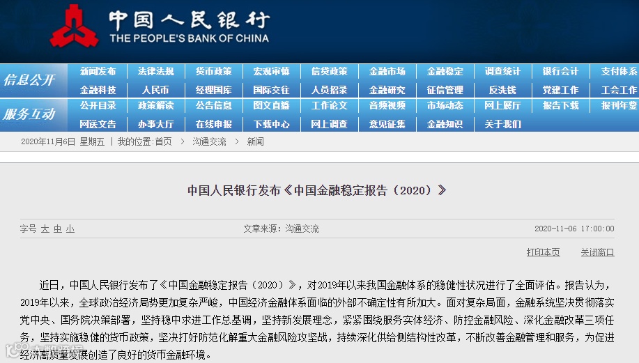 11月6日,央行发布《中国金融稳定报告(2020)》,对2019年以来我国金融体系的稳健性状况进行了全面评估。报告认为,2019年以来,全球政治经济局势更加复杂严峻,中国经济金融体系面临的外部不确定性有所加大。面对复杂局面,金融系统坚决贯彻落实党中央、国务院决策部署,坚持稳中求进工作总基调,坚持新发展理念,紧紧围绕服务实体经济、防控金融风险、深化金融改革三项任务,坚持实施稳健的货币政策,坚决打好防范化解重大金融风险攻坚战,持续深化供给侧结构性改革,不断改善金融管理和服务,为促进经济高质量发展创造了良好的货币金融环境。