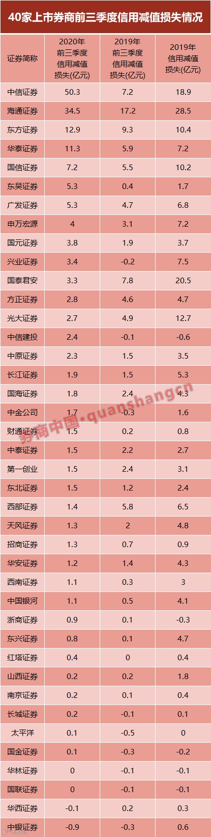 券商中国记者梳理发现,今年前三季度,40家A股上市券商累计计提信用减值规模为172.04亿元,较2019年同期的计提规模(93.51亿元)增加了83.98%,完成了2019年全年计提规模(194.22亿元)的88.58%,其中绝大部分计提都是受股权质押业务的拖累。