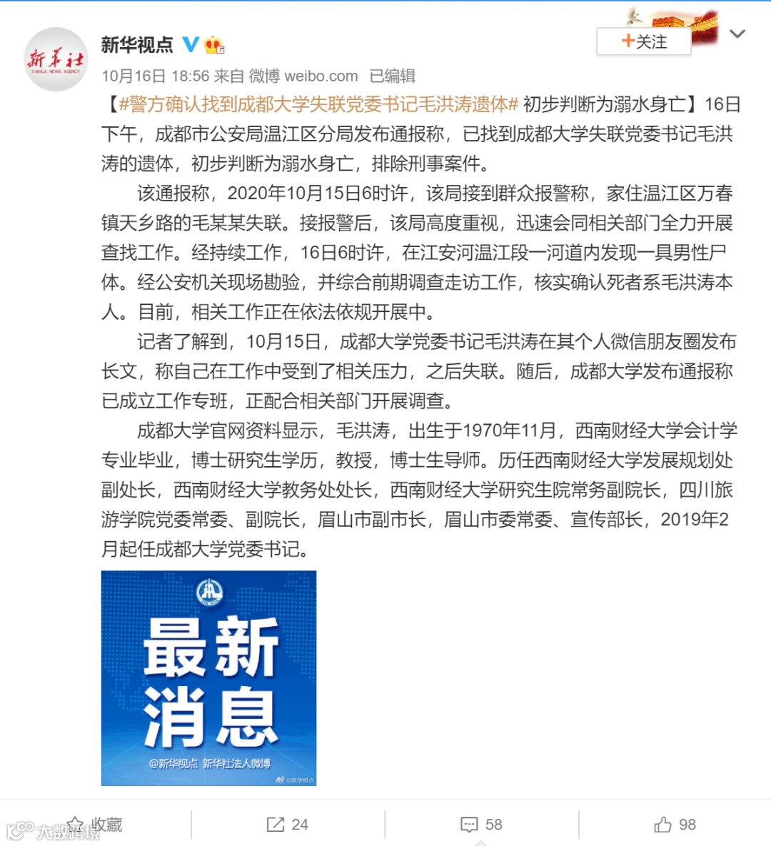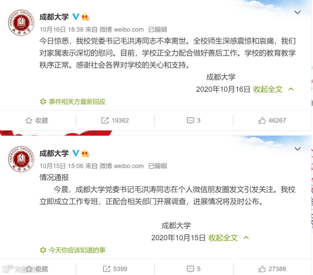 成都大学通报称,毛洪涛不幸离世,全校师生深感震惊和哀痛。
