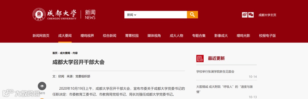 据成都大学官网发布的消息,2020年10月19日上午,成都大学召开干部大会,宣布市委关于成都大学党委书记的任职决定:市委教育工委书记、市教育局党组书记、局长刘强任成都大学党委书记。