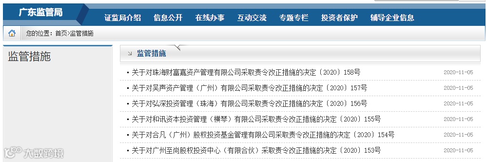 11月5日,广东证监局一口气公布了对6家私募机构的行政监管措施决定书。决定书透露,广东证监局近期对多家辖区内私募基金管理人进行了现场检查,发现多项违规行为,要求公司高度重视、追责到人、限期整改。