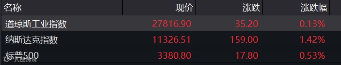 美东时间周四,美股三大指数收涨,截至收盘,道指涨0.13%,纳指涨1.42%,标普500指数涨0.53%。