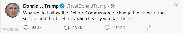对此,特朗普在推特上回应称,我上次轻松获胜,为什么要允许修改规则? 特朗普在推特上写道:“在我上次辩论轻松获胜的情况下,我为什么允许辩论委员会修改第二场和第三场辩论的规则?”