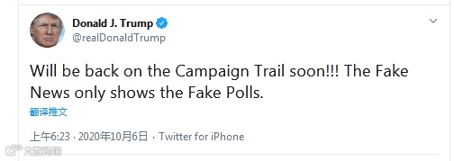 特朗普走出医疗中心前十几分钟,特朗普发推称,“很快将投入到竞选活动中去!假新闻只展示假民调。”